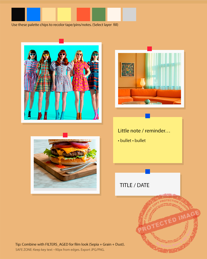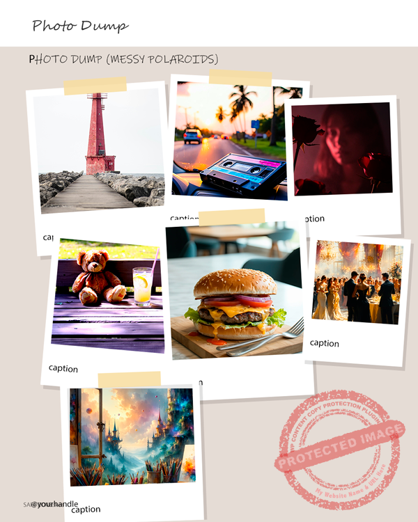 Real moments, not perfect feeds. Includes multiple messy polaroid slots layered and rotated for an authentic photo dump feel. Each photo has its own lighting and color controls.Customizable: - 7 visible photo slots + extra hidden slots - Replace photos easily - Adjust lighting per photo - Apply individual color filters - Toggle curls, tape, and texturesBest for: Lifestyle creators, travel, weekly recaps, personal brandsMEMORY BOARD / CORKBOARD Visual storytelling made easy. Combines photos and notes into one cohesive narrative layout designed for reflection and lessons learned.Customizable: - Replace photos - Edit notes - Toggle curled note corners - Add warm lighting, grain, dust, or scratchesBest for: Storytelling, reflections, personal journeys